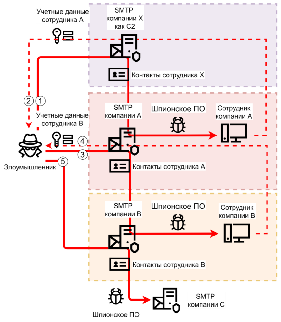 Анализ адресов отправителей и получателей в фишинговых электронных письмах, отправленных злоумышленниками, и адресов вновь обнаруживаемых командных серверов показал, что значительный процент украденных почтовых аккаунтов впоследствии используется как для распространения атаки со взломанных систем промышленного предприятия (на организации, являющиеся его деловыми партнерами и контрагентами), так и в качестве серверов сбора украденных данных. Эта тактика показана на схеме ниже.