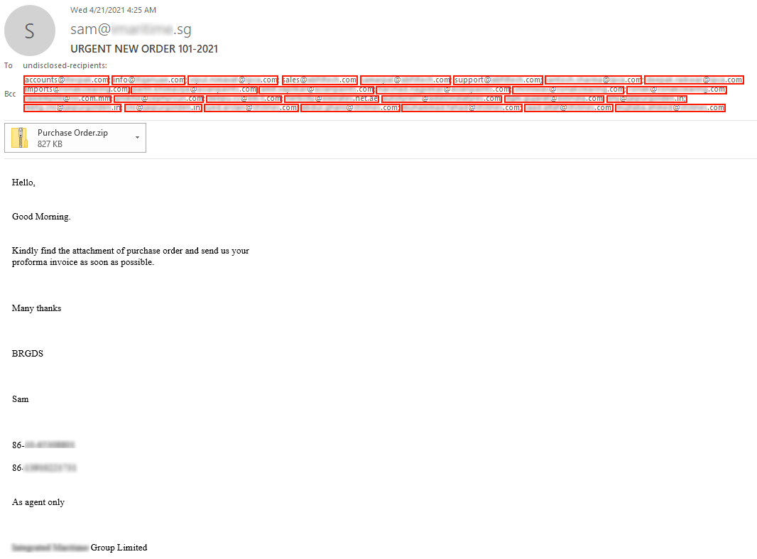 В ходе исследования аномалии мы обнаружили большое число кампаний, в которых вредоносное ПО распространяется от одного промышленного предприятия к другому через фишинговые письма, замаскированные под корреспонденцию организаций-жертв. При этом злоумышленники использовали корпоративные почтовые системы этих организаций для осуществления атак по спискам контактов, украденным из взломанных почтовых ящиков.