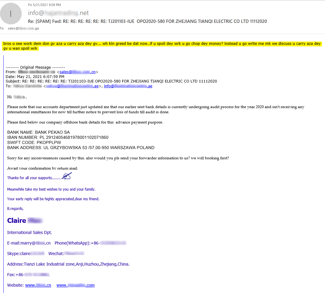 Некоторые злоумышленники на следующем этапе атаки применяли технику Business Email Compromise, — анализа деловой переписки и последующего мошенничества методами социальной инженерии с целью подмены данных банковских транзакций. Пример электронных писем, используемых в таких атаках, приведен ниже.