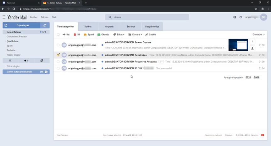 Другой пример — видеоурок, записанный продавцом инструмента OriginLogger. На видео виден интерфейс его почтового ящика на Яндексе на турецком языке. Кроме того, автор не совсем корректно использовал эффект размытия на видео и не полностью скрыл данные, собранные демонстрируемой шпионской программой. Анализ веб-адресов, собранных шпионской программой и отображаемых в веб-браузере создателя видеоурока, показывает, что у автора есть учетные записи на турецких форумах и даже в одном из турецких университетов.