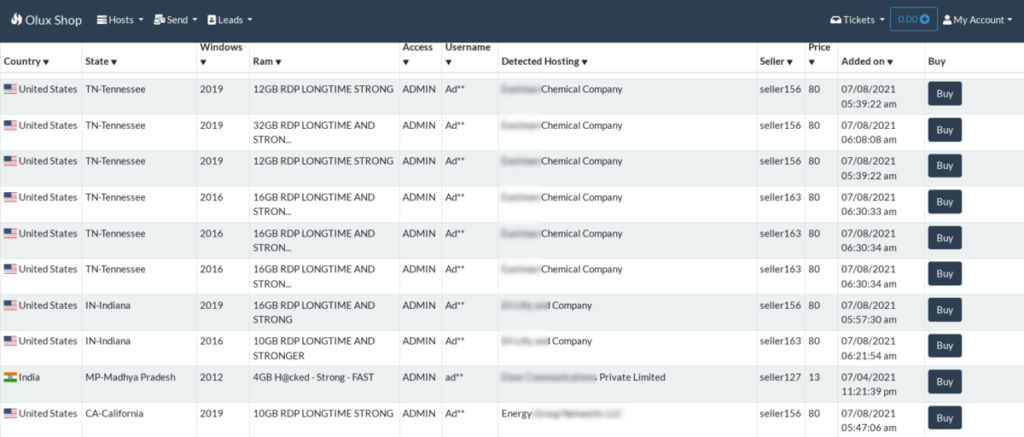 Есть много способов нелегитимного использования украденных данных аутентификации, в том числе наиболее опасными субъектами, такими как группы злоумышленников, специализирующихся на программах-вымогателях и APT. Как показывает анализ торговых площадок в интернете, наибольшим спросом пользуются учетные данные, обеспечивающие доступ к внутренним системам предприятий. Предложение, по-видимому, соответствует спросу: в ходе исследования на торговых площадках нами было обнаружено почти 2000 учетных записей RDP для промышленных предприятий.