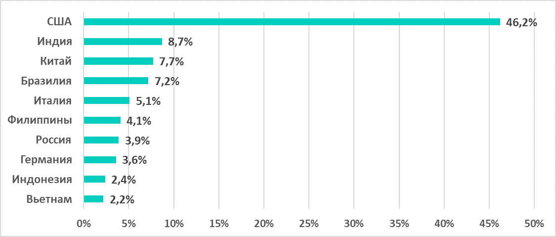 Статистика взломанных учетных записей RDP промышленных предприятий в разбивке по странам показывает, что более 46% учетных записей, продаваемых на торговых площадках, принадлежит компаниям из США, а остальные — компаниям из Азии, Европы и Латинской Америки.