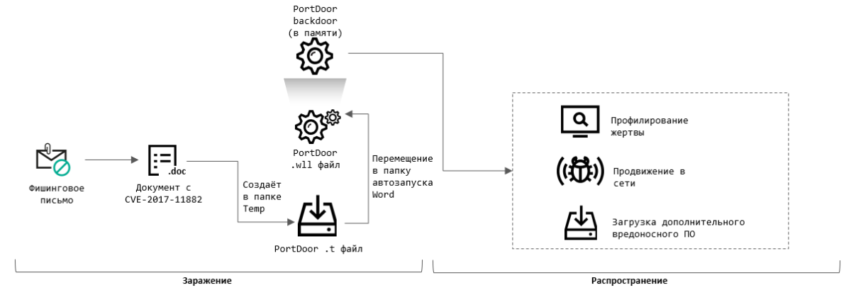 Документы Microsoft Word, вложенные в фишинговые письма, содержат вредоносный код, эксплуатирующий уязвимость CVE-2017-11882. Уязвимость позволяет выполнить произвольный код – в исследованных атаках это основной модуль вредоносного ПО PortDoor – без дополнительных действий со стороны пользователя.