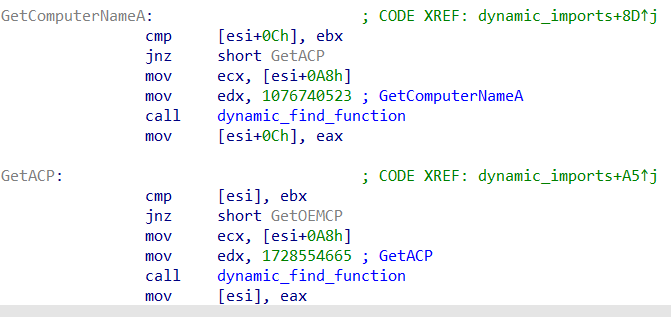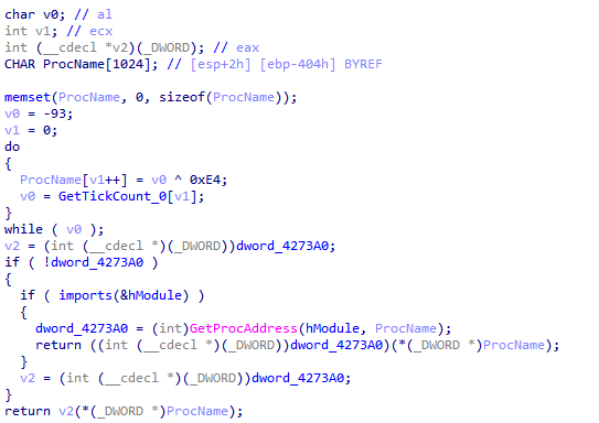 Как уже было упомянуто, в PortDoor применяется динамический импорт функций Windows API по хешам. Данная техника позволяет избежать наличия в коде программы имён импортируемых функций в виде строк и таким образом снизить вероятность обнаружения вредоносной программы. Сначала вредоносная программа загружает в память необходимые библиотеки, после чего PortDoor переходит к таблице экспорта загруженной библиотеки и считает контрольную сумму от имени каждой экспортируемой функции, пока не найдёт совпадение со значением хеша, заложенным в код вредоносной программы: