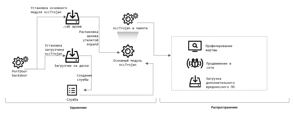 Установка nccTrojan производится при помощи загрузки файлов с сервера управления вредоносным ПО PortDoor. Исполняемый файл (DLL-библиотека) nccTrojan скачивается в виде .cab архива с произвольным именем, например wam.dll.cab. Затем для распаковки злоумышленники используют системную утилиту expand. Распаковка производится в одну из уже существующих в системе директорий легитимного ПО, например %ProgramData%\Intel\ShaderCache, %Program Files%\Common Files\AV\Norton Security Ultra, %ProgramData%\2GIS, %ProgramData%\Adobe и т.д.