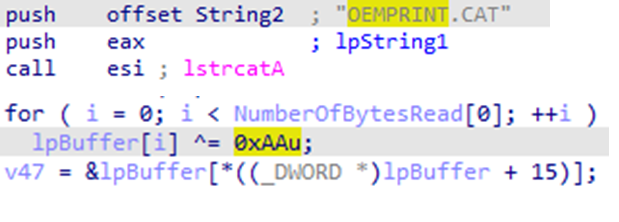 После доставки и распаковки Cotx/DNSep, злоумышленники используют технику dll hijacking в устаревших и уязвимых версиях приложений McAfee SecurityCenter, Sophos SafeStore Restore tool и Intel Common User Interface. Вредоносная библиотека, которая загружается и запускается в результате эксплуатации техники dll hijacking, расшифровывает исполняемый файл бэкдора, находящийся в файле с расширением .log.