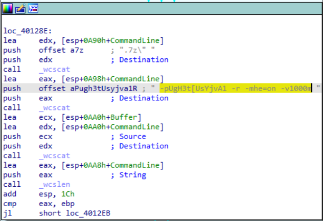 После получения контроля над большей частью ИТ-инфраструктуры атакованной организации злоумышленники приступают к этапу кражи конфиденциальной информации. Все файлы, собираемые злоумышленниками, упаковываются в ZIP-архивы под паролем, для автоматизации этого процесса злоумышленники используют собственную сборку утилиты 7-Zip.