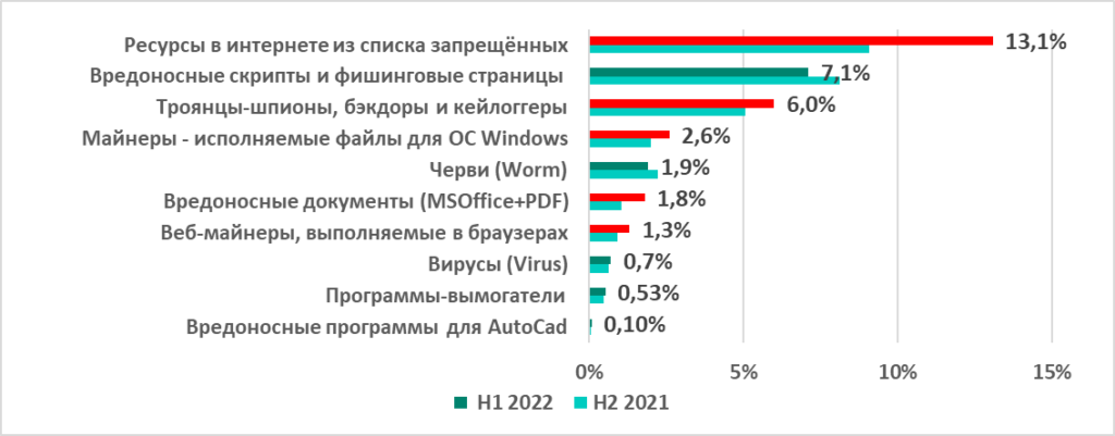 Если сравнивать процент атакованных компьютеров АСУ в России в первом полугодии 2022 с предыдущими полугодиями, то значимых изменений мы не видим. Этот процент довольно стабилен и близок к среднему по миру показателю.
