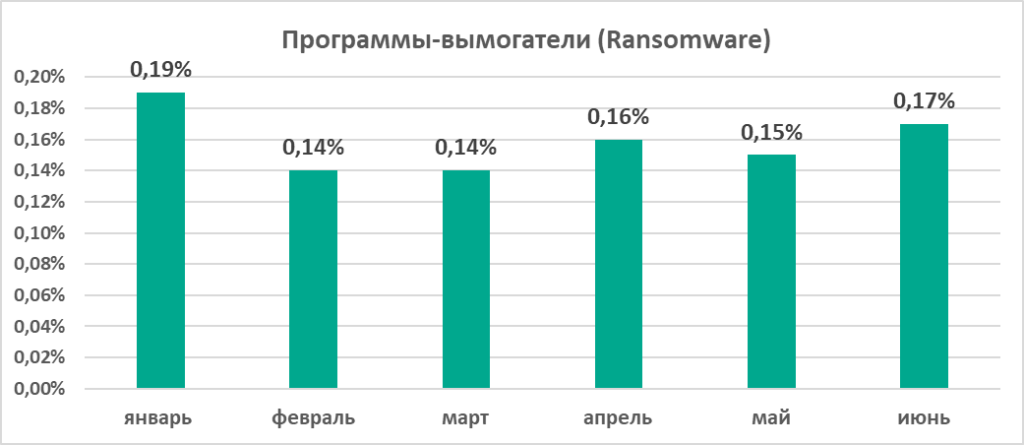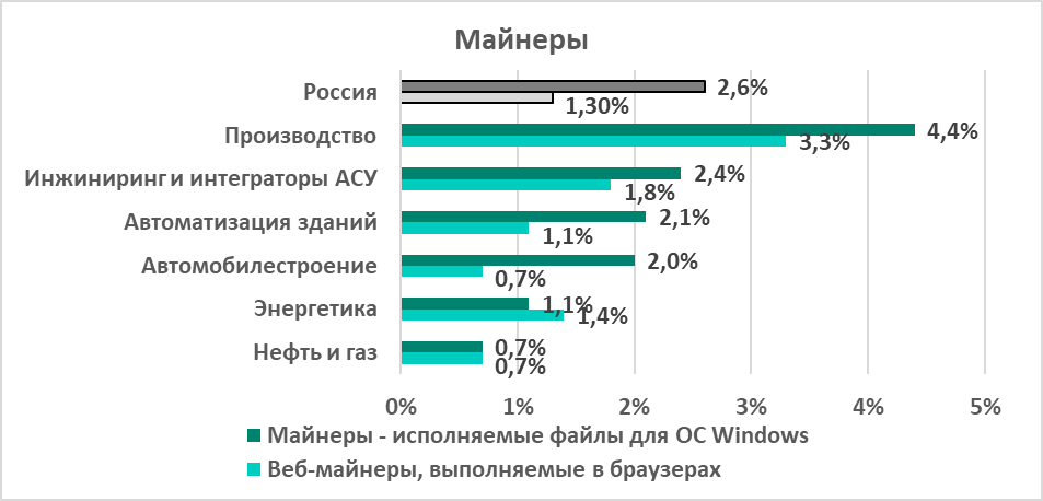 - вредоносные программы для майнинга криптовалюты (2,4% майнеры – исполняемые файлы для OC Windows и 1,8% – майнеры, выполняемые в браузерах),