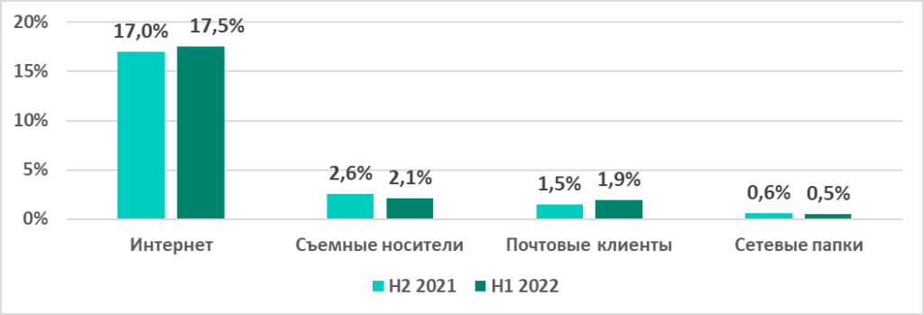 Основными источниками угроз для компьютеров АСУ остаются интернет, съемные носители и почтовые клиенты. За прошедшее полугодие процент компьютеров АСУ, на которых были заблокированы вредоносные объекты из каждого источника, изменился не более, чем на 0,5 п.п.