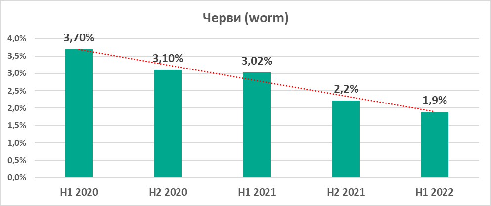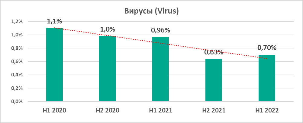 Начиная с первого полугодия 2020 года, мы наблюдаем снижение процента компьютеров АСУ, на которых были заблокированы вирусы и черви: