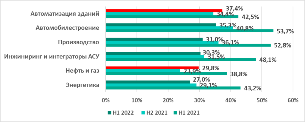 В первом полугодии 2022 процент атакованных компьютеров АСУ вырос в двух из шести отраслей – Нефть и газ и Автоматизация зданий. В остальных отраслях проценты уменьшились.