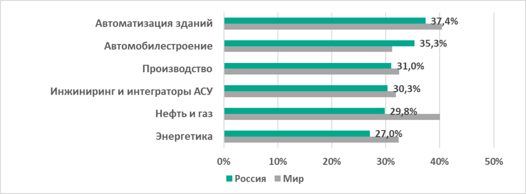 Мы сравнили статистику в нескольких отраслях. Как видно на графике ниже, процент компьютеров АСУ, на которых было заблокировано вредоносное ПО, варьирует в исследованных отраслях от 27% (Энергетика) до 37,4% (Автоматизация зданий).