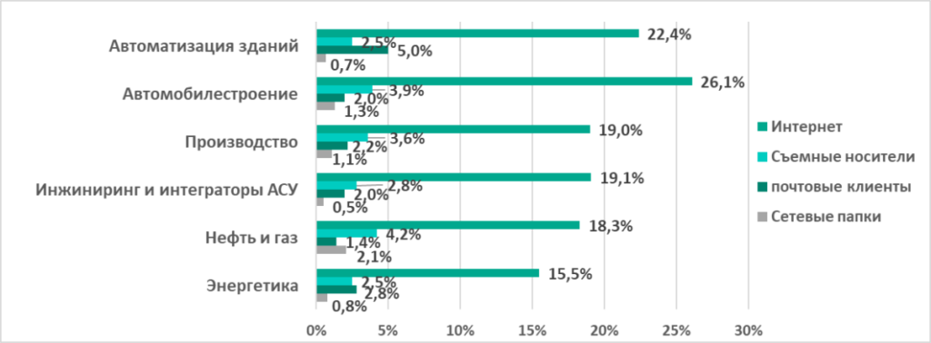 Если со съемными носителями как источником вредоносного ПО вопросов, как правило, не возникает (съемные носители часто используются для передачи информации в технологической сети предприятий), то наличие интернета и почтовых клиентов в статистике по источникам угроз часто вызывают недоумение. Откуда на компьютерах АСУ угрозы из интернета и почты?