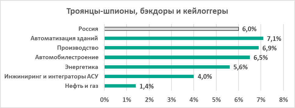 Как видно на графике выше, шпионское ПО входит в тройку лидеров по проценту компьютеров АСУ, на которых были заблокированы зловреды определенной категории.