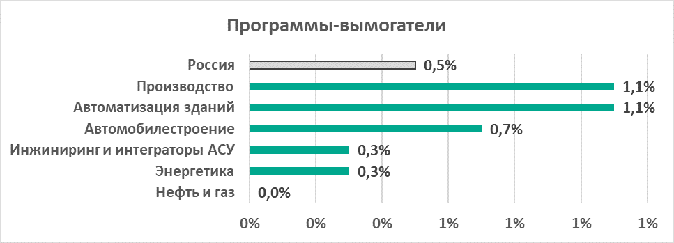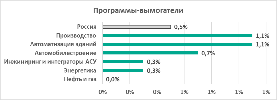 В производственном секторе процент атакованных вымогателями компьютеров АСУ вдвое выше, чем аналогичный показатель в среднем по России.