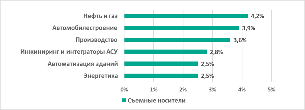 - Автомобилестроение на втором месте по проценту компьютеров АСУ, на которых угрозы были заблокированы при присоединении съемных носителей (3,9%). Разница показателей с отраслью, которая заняла первое место в этом рейтинге, – всего 0,3 п.п. (см. график ниже в разделе «Нефть и газ»).