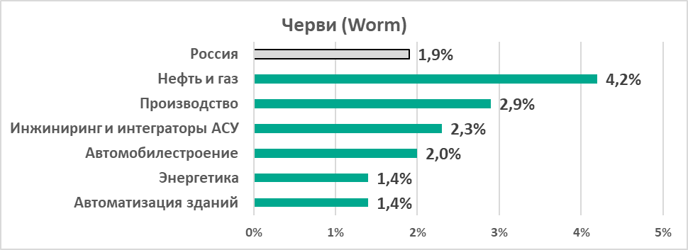 Учитывая два предыдущих пункта, первое место отрасли Нефть и газ в этом рейтинге кажется закономерным (как было отмечено выше, черви распространяются, в основном, на съемных носителях и через сетевые папки).