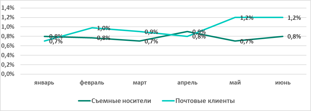 В то же время проценты компьютеров АСУ, на которых угрозы были заблокированы при подключении съемных носителей и в почте, в России меняются (больше-меньше) в «противофазе». Это актуально для изменений как по полугодиям, так и по месяцам первого полугодия 2022 года (за исключением аномального в этом году марта, когда, вероятно, падение показателей для угроз из почты было связанно с временным падением фишинговой активности).