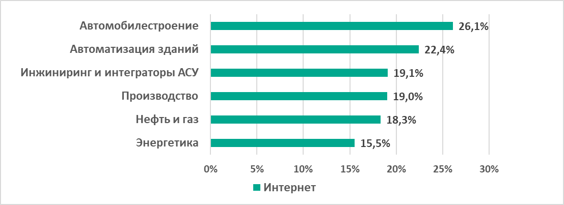 - Автоматизация зданий на втором месте в рейтингах по угрозам из интернета (22,4%) и ресурсам в интернете из списка запрещенных (14,2%).