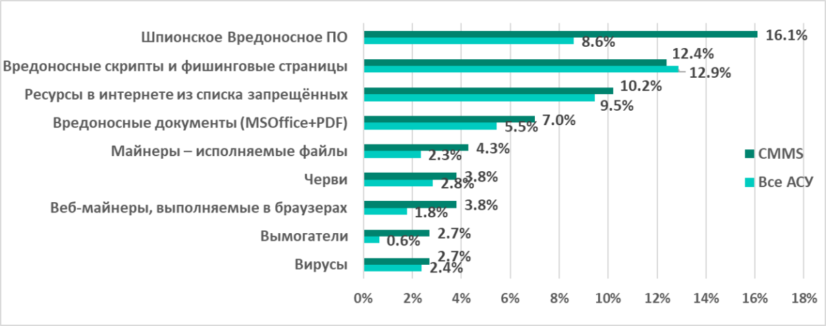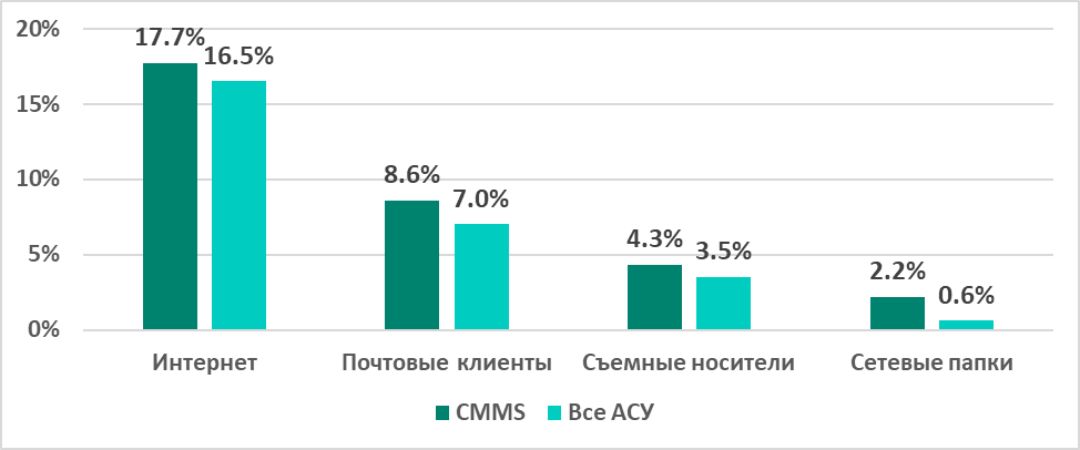 Процент CMMS, на которых были заблокированы угрозы из разных источников, получился следующим: