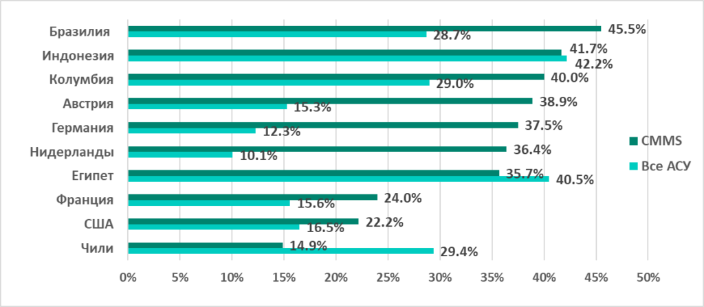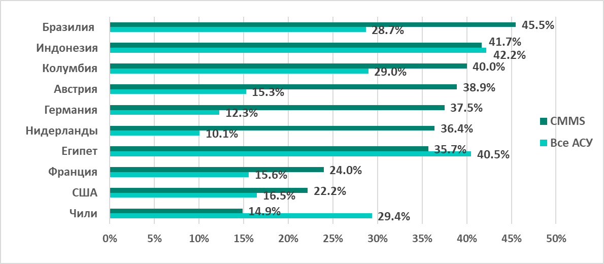 Показательно, что в топ 10 стран по проценту CMMS, атакованных в первом полугодии 2022 года, вошли традиционно «благополучные» страны, не попадающие в топ по общим показателям процента атакованных компьютеров АСУ в стране: