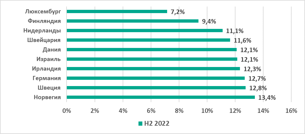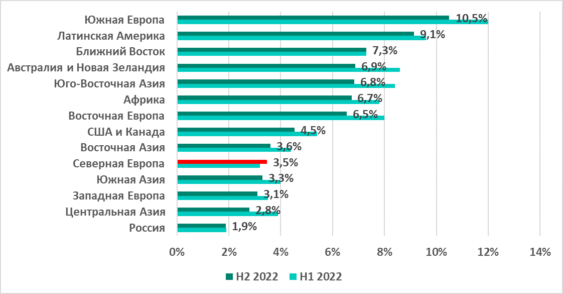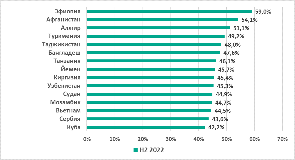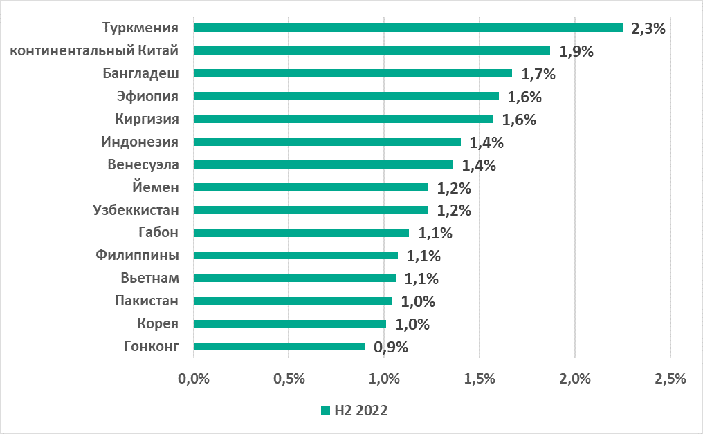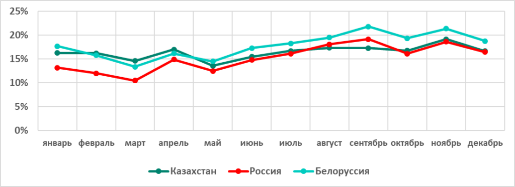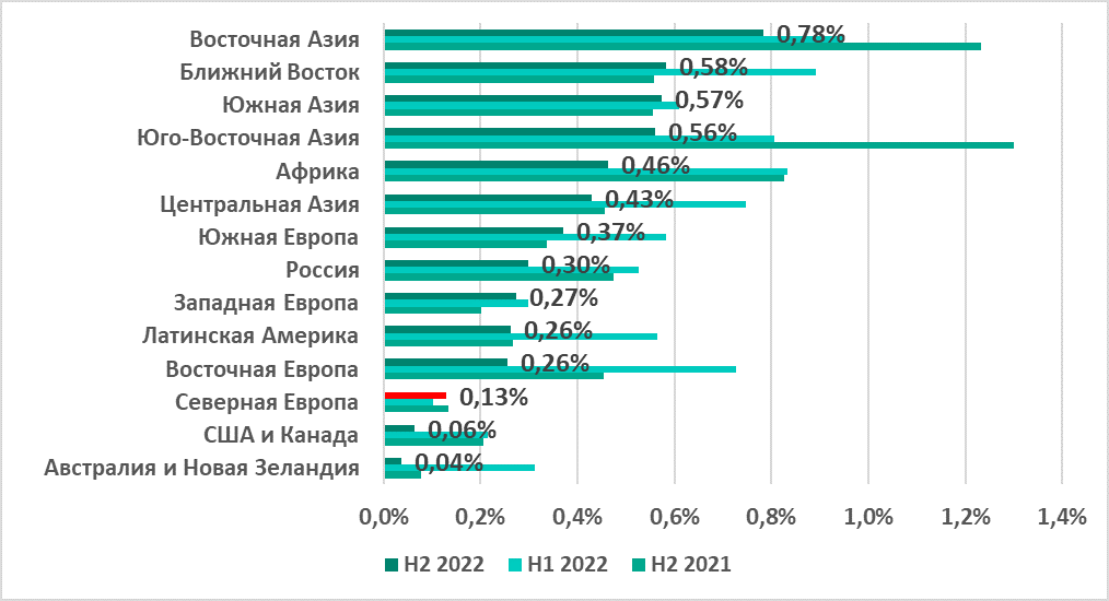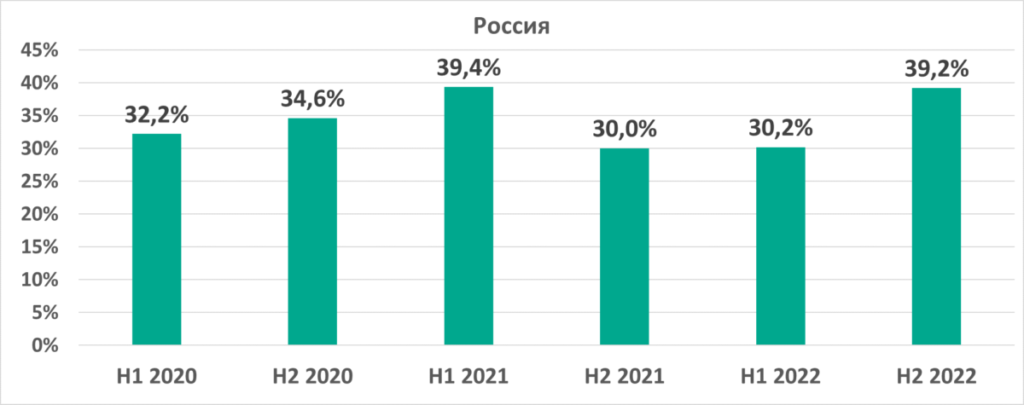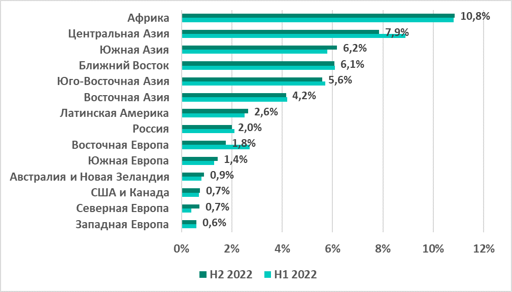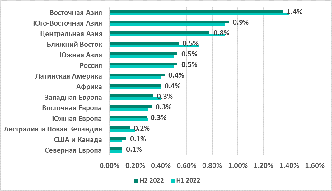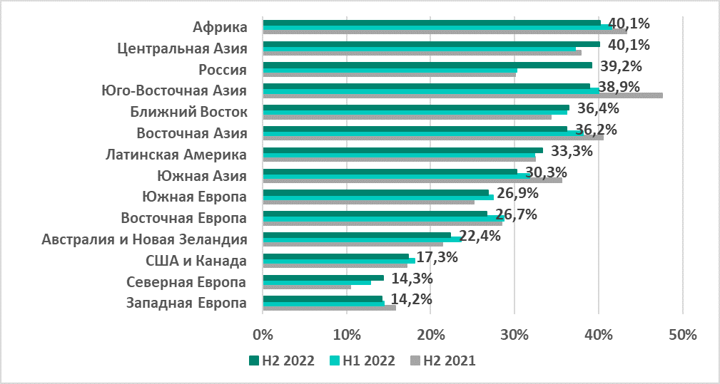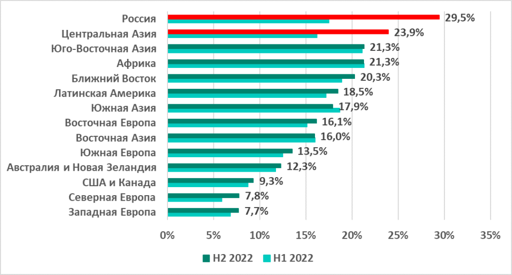 В России был отмечен самый высокий показатель из всех регионов (18,2%) и самый значительный рост — +11 п.п. по сравнению с первым полугодием. Центральная Азия с 14,2% заняла четвертое место в рейтинге регионов по этому показателю, однако в регионе также отмечен его заметный рост за второе полугодие — +5,7 п.п.