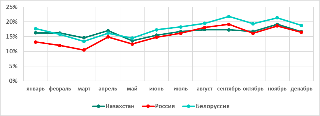 - в Белоруссии – на 10,3 п.п. и по итогам полугодия составил 17,8%;