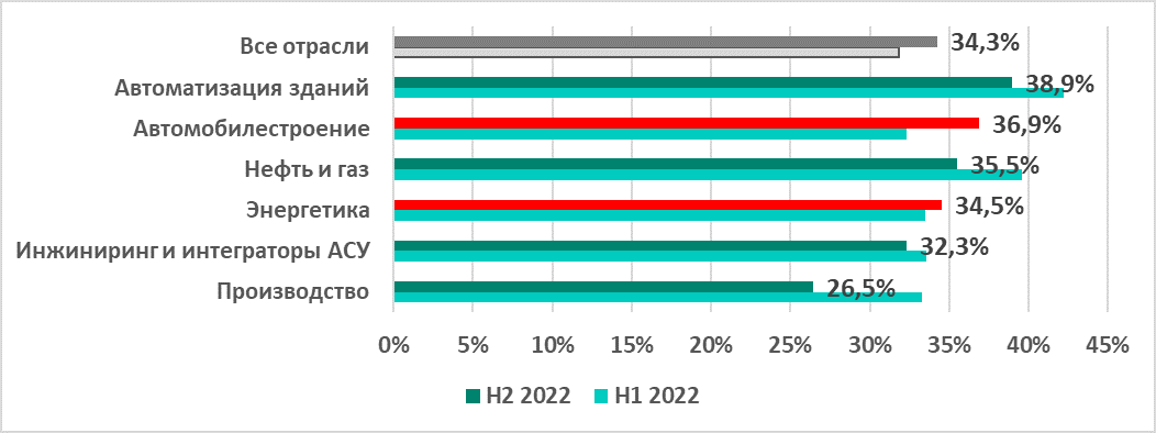 Отличается ситуация и в разных отраслях. Как видно на графике ниже, во втором полугодии 2022 года процент компьютеров АСУ, на которых были заблокированы вредоносные объекты, увеличился в автомобилестроении (+4,6 п.п.) и в энергетике (+1 п.п.). В остальных исследуемых отраслях показатель уменьшился.
