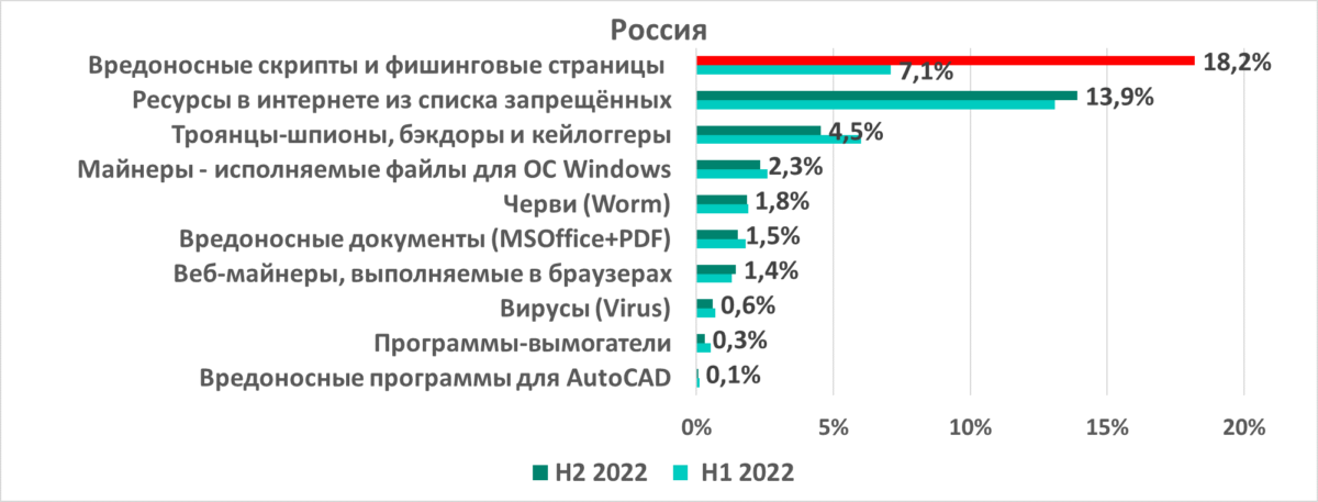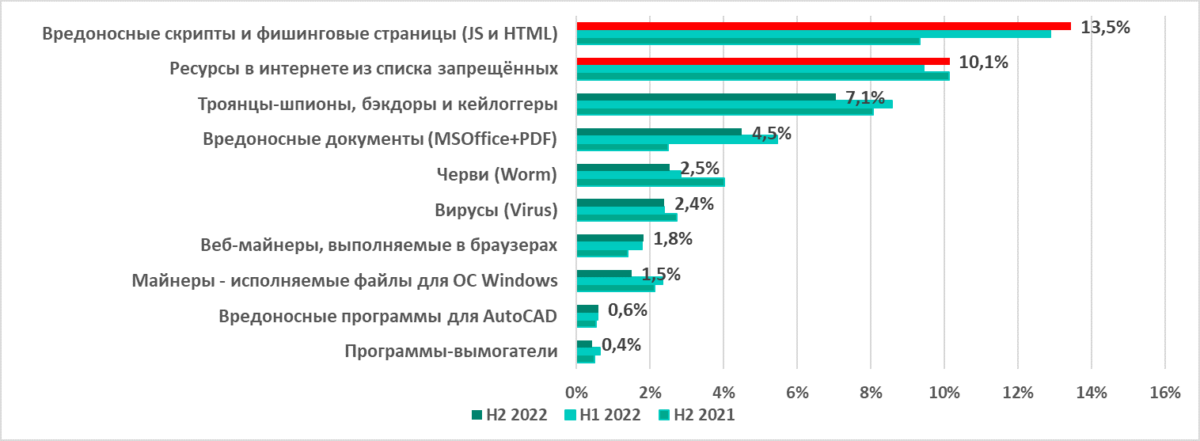 В первом полугодии 2022 года в аналогичном рейтинге увеличились показатели нескольких категорий вредоносных объектов. Во втором полугодии подросли только две лидирующие в этом рейтинге категории — вредоносные скрипты и фишинговые страницы (JS и HTML) иресурсы из интернета из списка запрещённых. Показатели остальных категорий вредоносных объектов во втором полугодии 2022 года либо уменьшились, либо остались без изменений.