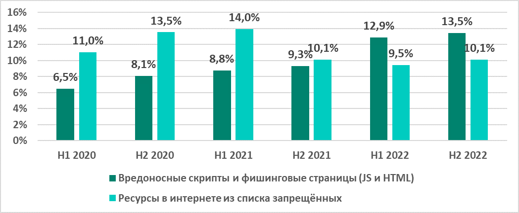 В 2022 году вредоносные скрипты и фишинговые страницы потеснили в этом рейтинге многолетнего лидера — ресурсы из интернета из списка запрещённых.