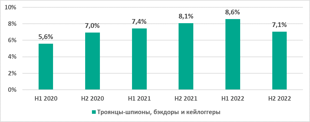 | Троянцы-шпионы, бэкдоры и кейлоггеры | 8,6% | 7,1% | 9,2% |
