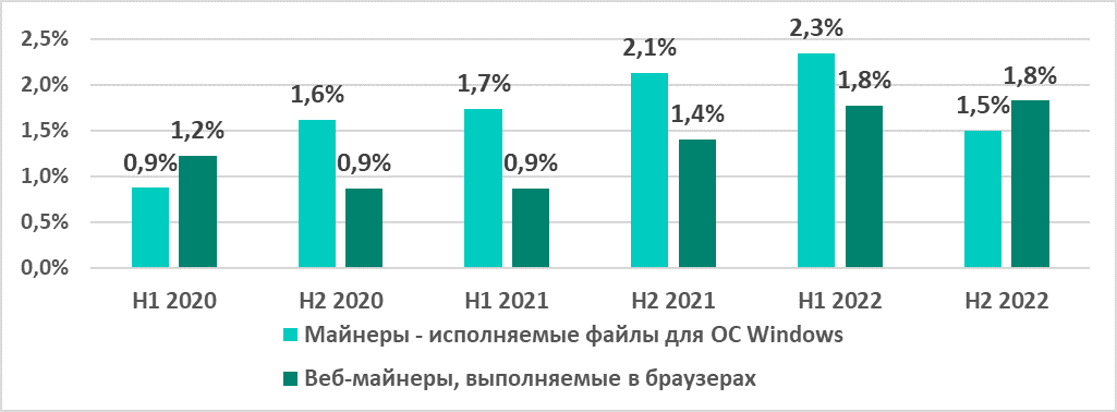 | Веб-майнеры, выполняемые в браузерах | 1,8% | 1,8% | 2,5% |