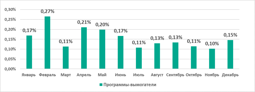 Наибольший процент компьютеров АСУ, на которых были заблокированы программы-вымогатели, в течение 2022 года был отмечен в феврале (0,27%), наименьший — в ноябре (0,10%).