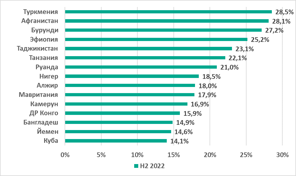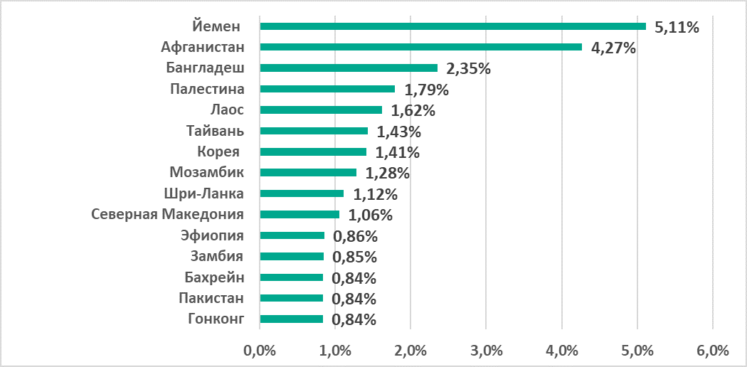 Среди стран и территорий по этому показателю лидируют Йемен (22,3%), Алжир (18,3%), Шри-Ланка (18,3%) и Сербия (17,2%).