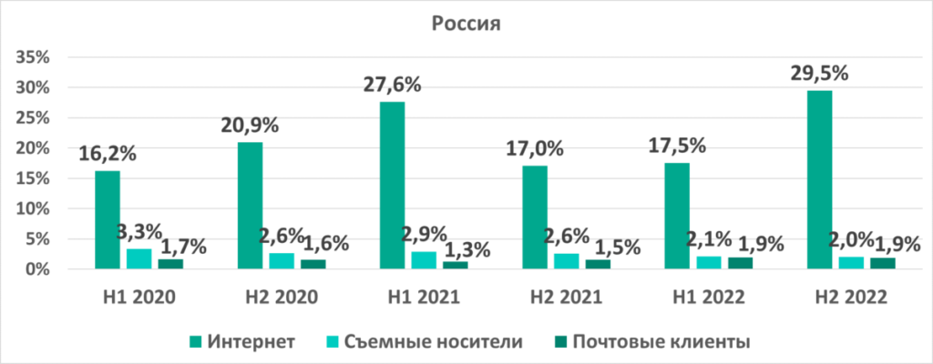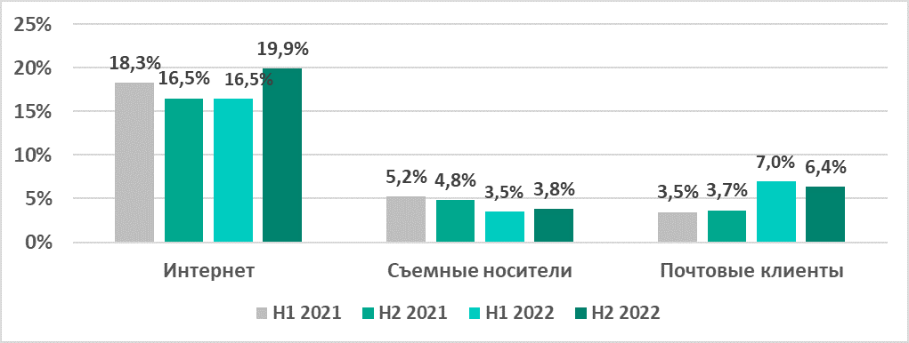 Уменьшение показателя по сравнению с первым полугодием 2022 года в производственной и нефтегазовой отраслях связано со снижением показателей для интернет- и почтовых угроз.