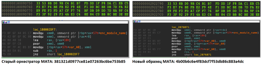 Проанализированная нами в рамках данной кампании вредоносная программа MATA-3 использовала в ходе выполнения встроенный 64-байтовый ключ XOR для расшифровки имени DLL-файла и имен API. Точно такой же ключ XOR уже использовался ранее MATA 2-го поколения. Сам же код функции расшифровки также отличается незначительно: