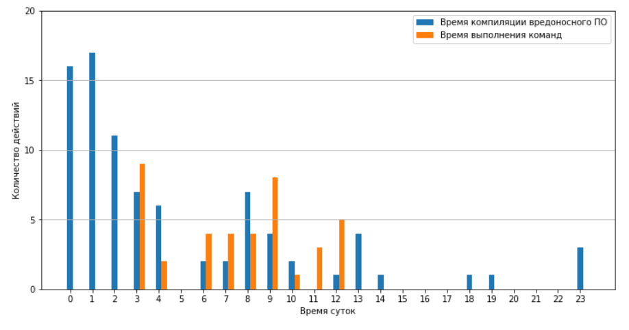 Для определения часового пояса злоумышленников, стоявших за этой кампанией, мы проанализировали два временных параметра: время компиляции зловреда и время доставки команд бэкдора. Это позволило определить время активности авторов и операторов зловреда. Из 84 вредоносных образцов около половины было создано в период 00:00–02:00 GMT; лишь отдельные эпизоды компиляции наблюдались в период 14:00–23:00 GMT, из чего можно сделать вывод, что автор вредоносного ПО не проявлял активности в это время. Активная работа с клавиатурой наблюдалась только в период 03:00–12:00 GMT, и мы не смогли обнаружить какие-либо доставленные команды в период 13:00–23:00 GMT.