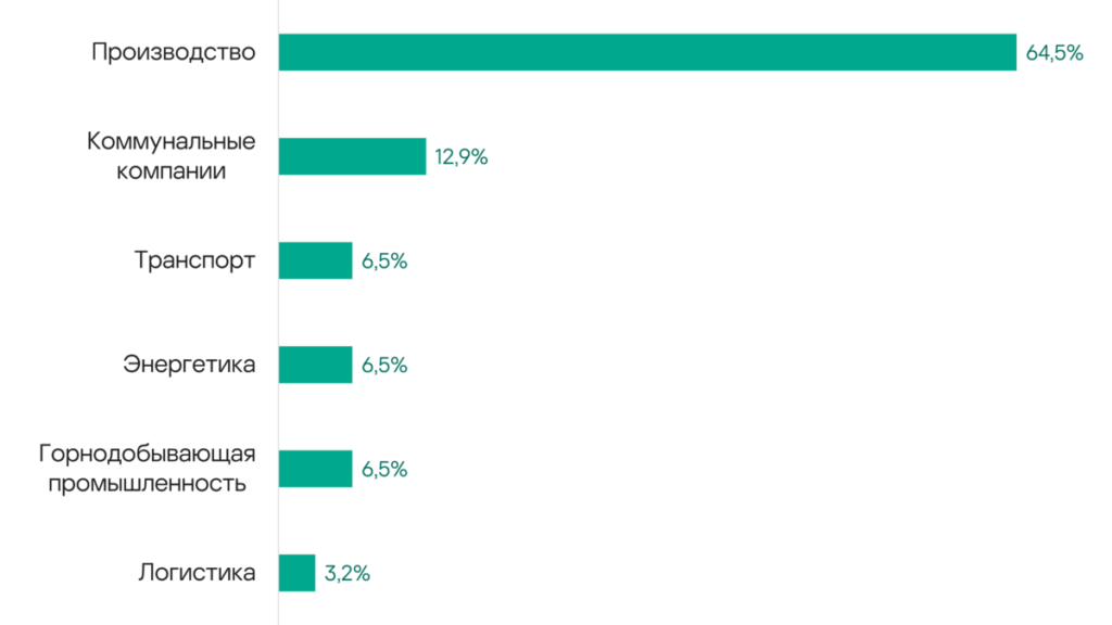 - 2/3 жертв относятся к сфере производства. 50% всех жертв из сферы производства сообщили о нарушении операционной деятельности, что составляет 100% от общего числа жертв, подтвердивших останов операционной деятельности в результате атаки. Организации из этой сферы либо менее устойчивы к атакам, либо просто более честно сообщают общественности о произошедшем.