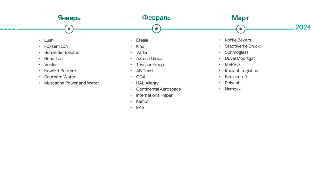 - В общей сложности жертвами подтверждено 30 инцидентов. Это хорошо согласуется с предыдущими периодами (более 60 публично подтвержденных случаев за полгода).