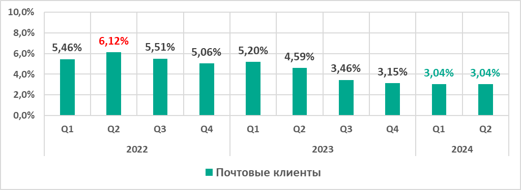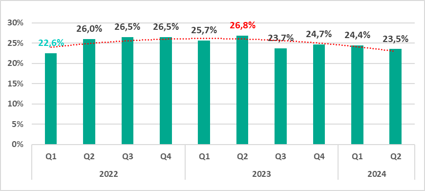 По сравнению со вторым кварталом 2023 года процент уменьшился на 3,3 п.п.