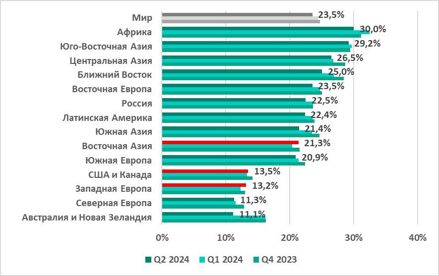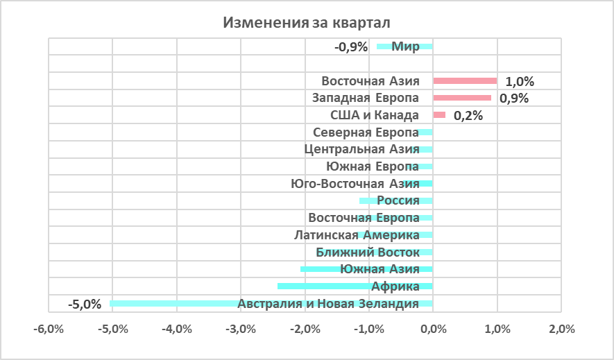 В четырех регионах — Восточной Азии, Австралии и Новой Зеландии, США и Канаде, а также Западной Европе — показатели увеличились по сравнению с предыдущим кварталом.