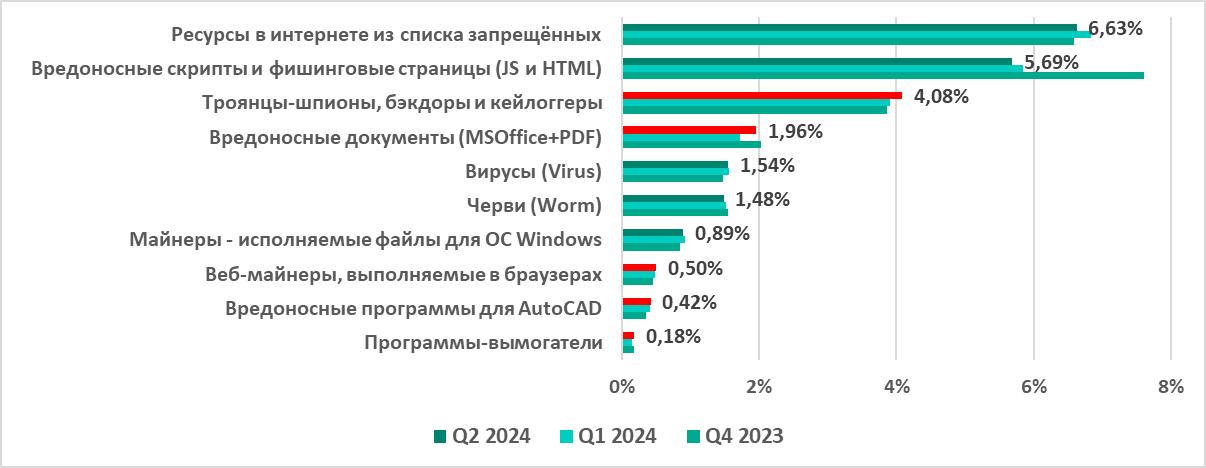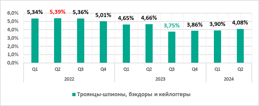 | Троянцы-шпионы, бэкдоры и кейлоггеры | 3,90% | 4,08% | 0,18 п.п. |