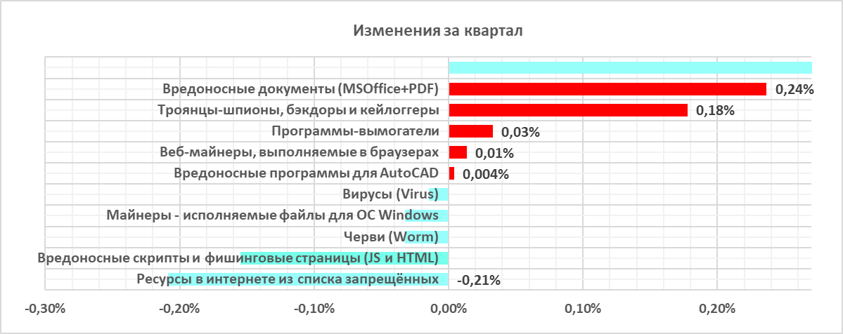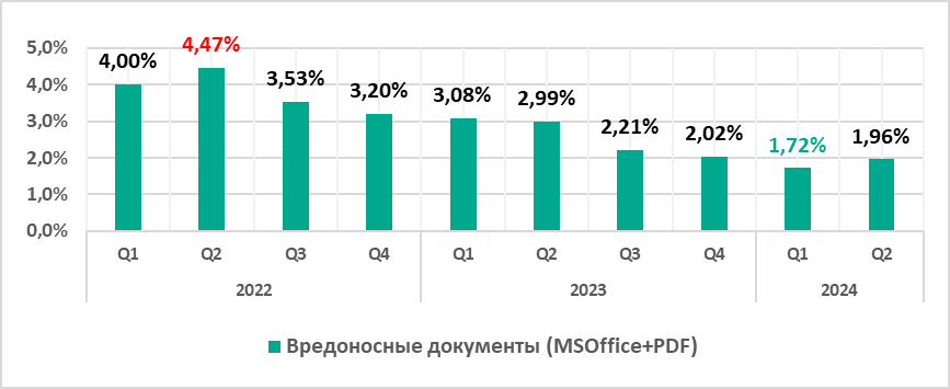 | Вредоносные документы (MSOffice + PDF) | 1,72% | 1,96% | 0,24 п.п. |
