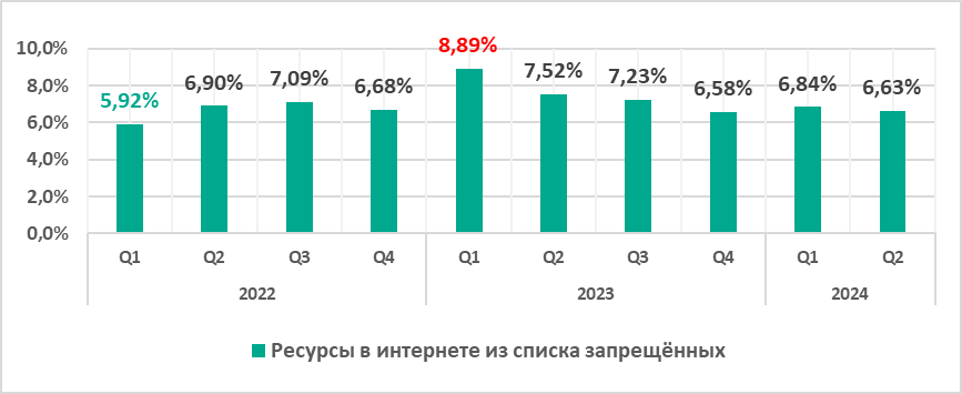 | Ресурсы в интернете из списка запрещённых | 6,84% | 6,63% | -0,21 п.п. |