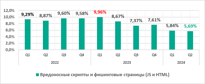 | Вредоносные скрипты и фишинговые страницы (JS и HTML) | 5,84% | 5,69% | -0,15 п.п. |