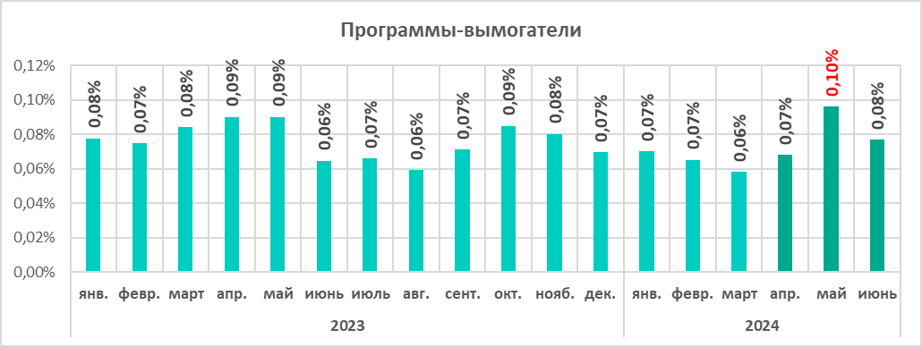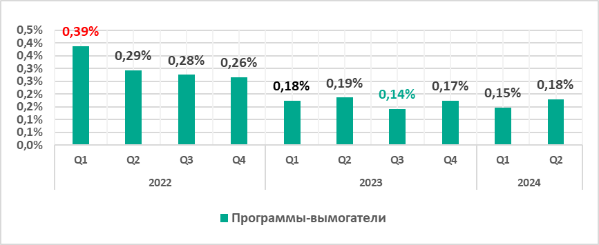 | Программы-вымогатели | 0,15% | 0,18% | 0,03 п.п. |