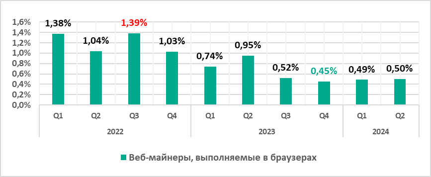 | Веб-майнеры, выполняемые в браузерах | 0,49% | 0,50% | 0,01 п.п. |