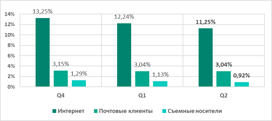 Для угроз из почты и угроз, распространяемых на съемных носителях, показатель за второй квартал 2024 года, как и за первый, был минимальным с 2022 года. Для интернета процент был меньше только два года назад — в первом квартале 2022 года.