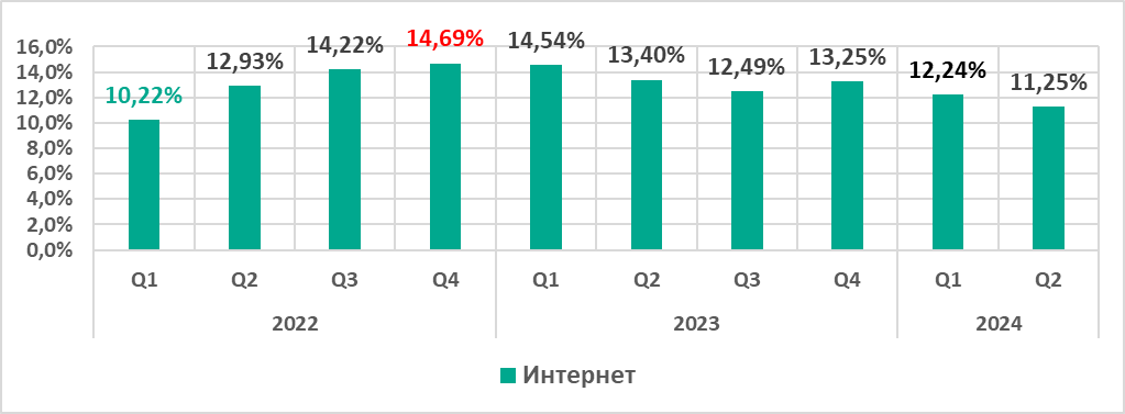 | Интернет | 12,24% | 11,25% | -0,99 п.п. |